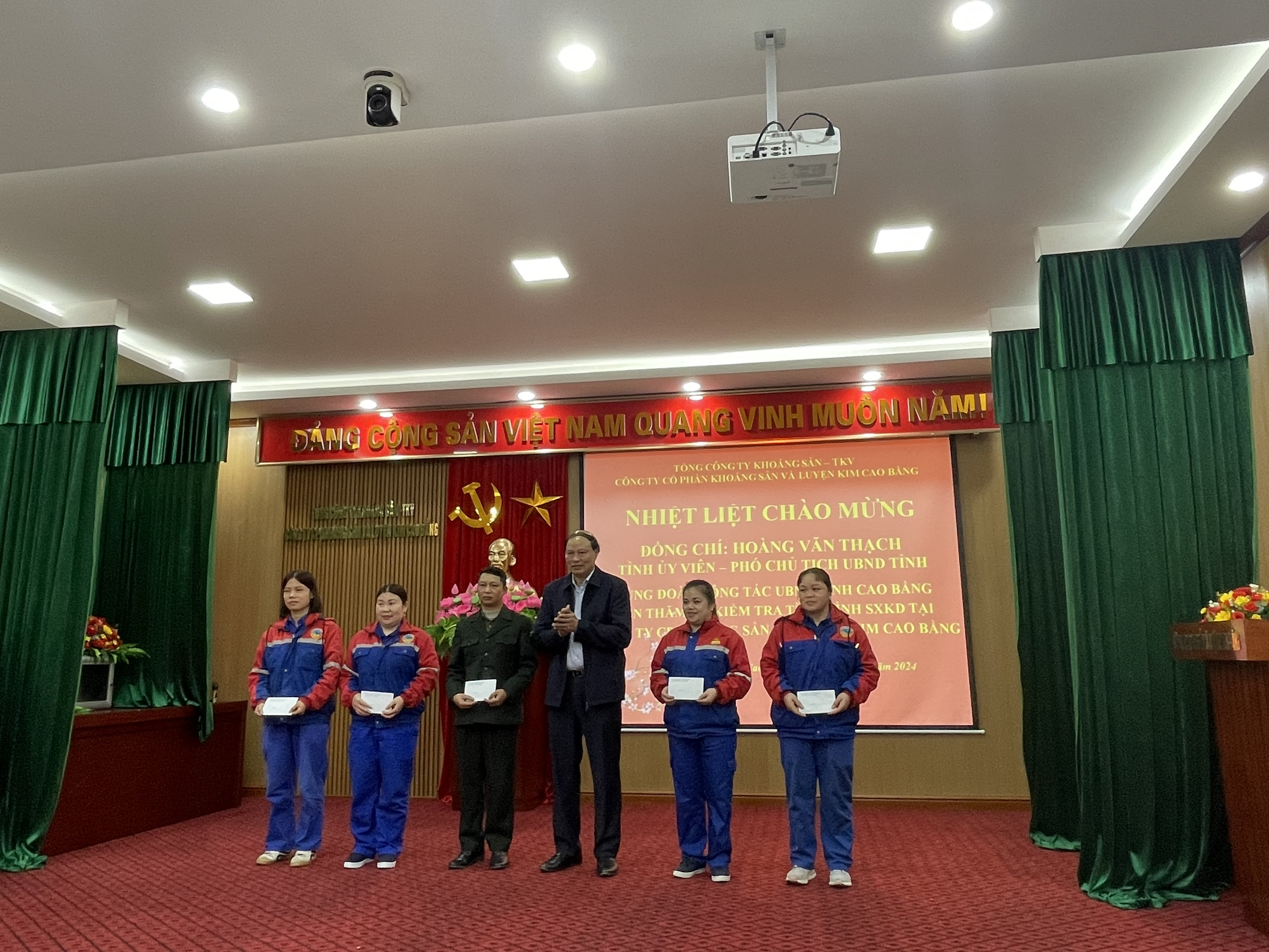 Phó Chủ tịch UBND tỉnh Hoàng Văn Thạch trao quà của UBND tỉnh tặng cán bộ, người lao động của Công ty cổ phần Khoáng sản và Luyện kim Cao Bằng.