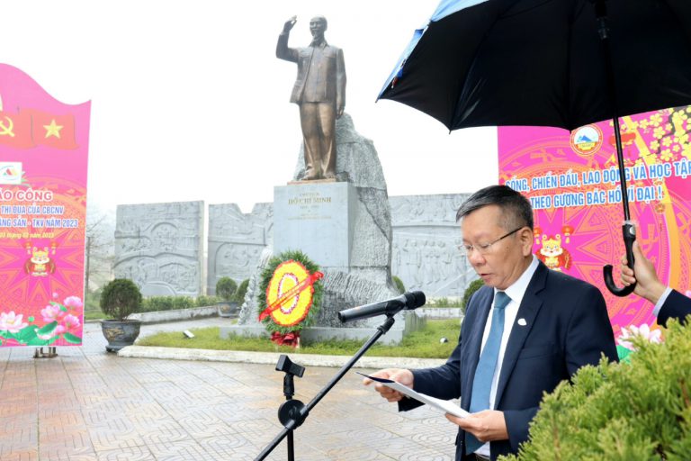 Sáng ngày 03/02/2023, Tổng Công ty Khoáng sản – TKV (VIMICO) đã tổ chức Lễ báo công dâng Bác và phát động thi đua năm 2023 tại Khu di tích lịch sử Tĩnh Túc (huyện Nguyên Bình, tỉnh Cao Bằng). Đây là một hoạt động ý nghĩa đã trở thành truyền thống được TCT Khoáng sản duy trì nhiều năm qua mỗi khi vào dịp đầu Xuân mới. Sau khi dâng hương tưởng niệm Bác tại Phòng truyền thống của Công ty CP Khoáng sản & Luyện kim Cao Bằng, các đại biểu cùng về Khu di tích lịch sử truyền thống dâng hoa trước tượng Bác Hồ và tổ chức Lễ báo công, phát động thi đua năm 2023. Trong không khí thiêng liêng và xúc động, trước anh linh của Người, đồng chí Trịnh Văn Tuệ – Bí thư Đảng ủy, Tổng Giám đốc Tổng công ty, đại diện cho toàn thể cán bộ, đảng viên, công nhân ,viên chức, người lao động của Tổng công ty Khoáng sản – TKV báo cáo với Bác những thành tích của toàn thể CBCNV Tổng công ty đã đạt được trong năm 2022. Báo cáo nêu rõ: Trong suốt những năm qua, đội ngũ cán bộ và công nhân lao động toàn ngành khoáng sản luôn đoàn kết, phát huy tốt truyền thống “Kỷ luật và Đồng tâm” của Thợ mỏ, vượt qua mọi khó khăn, gian khổ, thiếu thốn; không ngừng phấn đấu học tập và làm theo lời Bác dạy, luôn tuyệt đối tin tưởng vào sự lãnh đạo của Đảng, Nhà nước và của Tập đoàn; cùng nhau đoàn kết, khắc phục mọi khó khăn, phấn đấu hoàn thành tốt nhiệm vụ được giao; góp phần tích cực cho sự nghiệp xây dựng và phát triển bền vững ngành khoáng sản Việt Nam. Nhân buổi Lễ báo công này, sau khi ghi nhận, biểu dương và chúc mừng những kết quả, thành tích mà tập thể cán bộ, công nhân lao động trong toàn Tổng công ty, Tổng Giám đốc Trịnh Văn Tuệ cũng nhấn mạnh: Để phát triển bền vững trong giai đoạn tới, tôi đề nghị tập thể cán bộ, công nhân lao động toàn ngành cần tập trung làm tốt một số nội dung sau: Một là: Tiếp tục chấn chỉnh, duy trì kỷ luật, kỷ cương. Rà soát, hoàn thiện các quy chế, quy định quản lý áp dụng thống nhất trong toàn Tổng công ty. Hai là: Đẩy mạnh công tác khảo sát, thăm dò phát triển tài nguyên, để có cơ sở tài nguyên chắc chắn cho việc lập và triển khai thực hiện kế hoạch. Tiếp tục đổi mới, áp dụng khoa học, công nghệ tiên tiến, nhằm tăng năng suất lao động, trong đó tập trung vào công nghệ tuyển, luyện. Đẩy mạnh công tác sáng kiến cải tiến kỹ thuật, trong đó chú trọng vào các giải pháp nâng cao năng suất, chỉ tiêu công nghệ, cải tiến thiết bị và cải thiện điều kiện làm việc cho người lao động. Tăng cường công tác khoán quản trị chi phí, nhằm tiết giảm chi phí, hạ giá thành sản phẩm, nâng cao hiệu quả sảnxuất kinh doanh. Ba là: Tăng cường công tác đào tạo, thu hút nguồn nhân lực có tay nghề cao; xây dựng đội ngũ cán bộ lãnh đạo, cán bộ quản lý, chuyên gia, công nhân kỹ thuật có trình độ chuyên môn cao và giàu kinh nghiệm, nhằm đáp ứng nhu cầu phục vụ sản xuất hiện tại và chuẩn bị cho mở rộng sản xuất sau này của Tổng công ty. Tiếp tục rà soát, sắp xếp, tái cơ cấu lao động theo quy định của Tập đoàn. Bốn là: Đẩy mạnh các biện pháp đảm bảo “An toàn – An ninh – An sinh” trong toàn Tổng công ty. Thực hiện nghiêm túc các quy trình, quy phạm, các giải pháp đảm bảo ATLĐ trong sản xuất. Quan tâm, chăm lo cải thiện điều kiện làm việc, đời sống vật chất và tinh thần cho người lao động. Năm là: Thường xuyên tăng cường vai trò lãnh đạo và sức chiến đấu của các cấp ủy Đảng; xây dựng các đoàn thể quần chúng trong sạch, vững mạnh. Sáu là: Tăng cường mối quan hệ truyền thống giữa doanh nghiệp với cấp ủy, chính quyền và nhân dân địa phương. Tạo sự đồng thuận, gắn kết giữa địa phương và doanh nghiệp. Hứa trước anh linh Người, Tổng Giám đốc Trịnh Văn Tuệ xin khẳng định: “Với niềm tự hào về bề dày truyền thống lịch sử của ngành, toàn Tổng công ty tiếp tục phát huy tốt truyền thống “Kỷ luật và Đồng tâm”, nỗ lực vượt qua mọi khó khăn, thách thức đưa ngành khoáng sản phát triển mạnh mẽ và bền vững. Sau Lễ báo công, đồng chí Bùi Văn Chu – Chủ tịch Công đoàn Tổng công ty đã phát động và kêu gọi toàn thể CBCNV Tổng công ty nêu cao tinh thần đoàn kết, quyết tâm phấn đấu hoàn thành toàn diện các chỉ tiêu kế hoạch SXKD năm 2023, Giám đốc KSLKCB – đại diện cho các đơn vị – phát biểu hưởng ứng và phát động phong trào thi đua tại đơn vị.